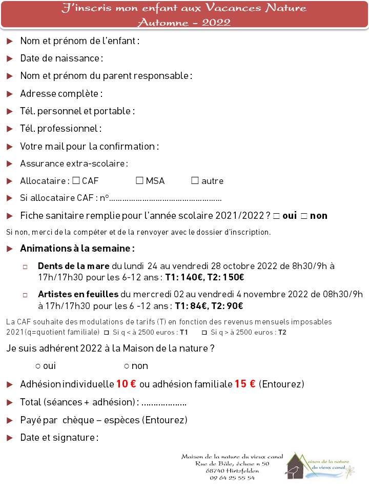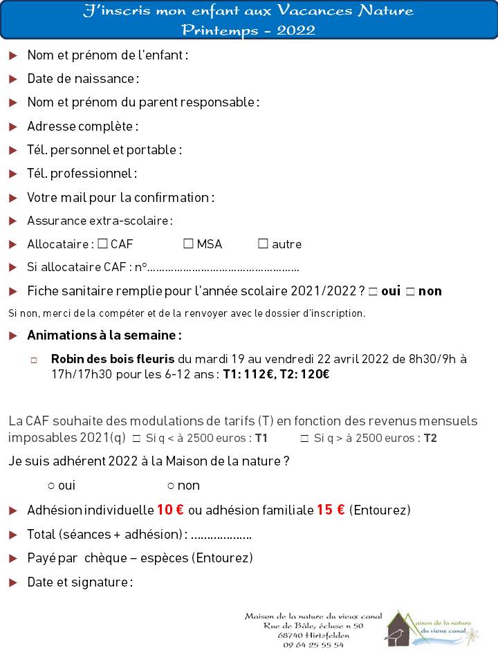 - Dossier d'inscription pour les vacances nature : "cliquez ici"